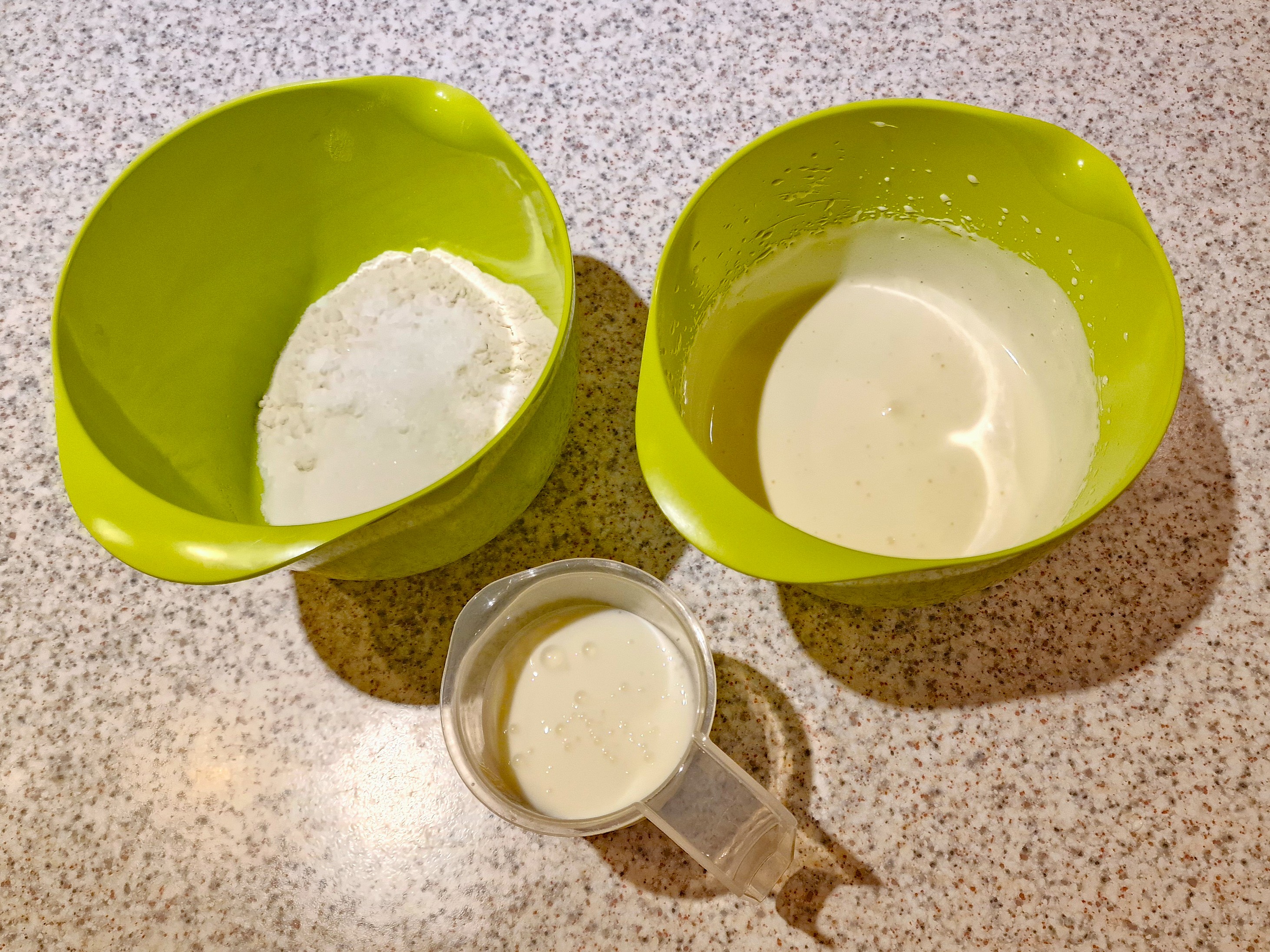 Vend det, og kærnemælken, i det piskede æg og sukker.