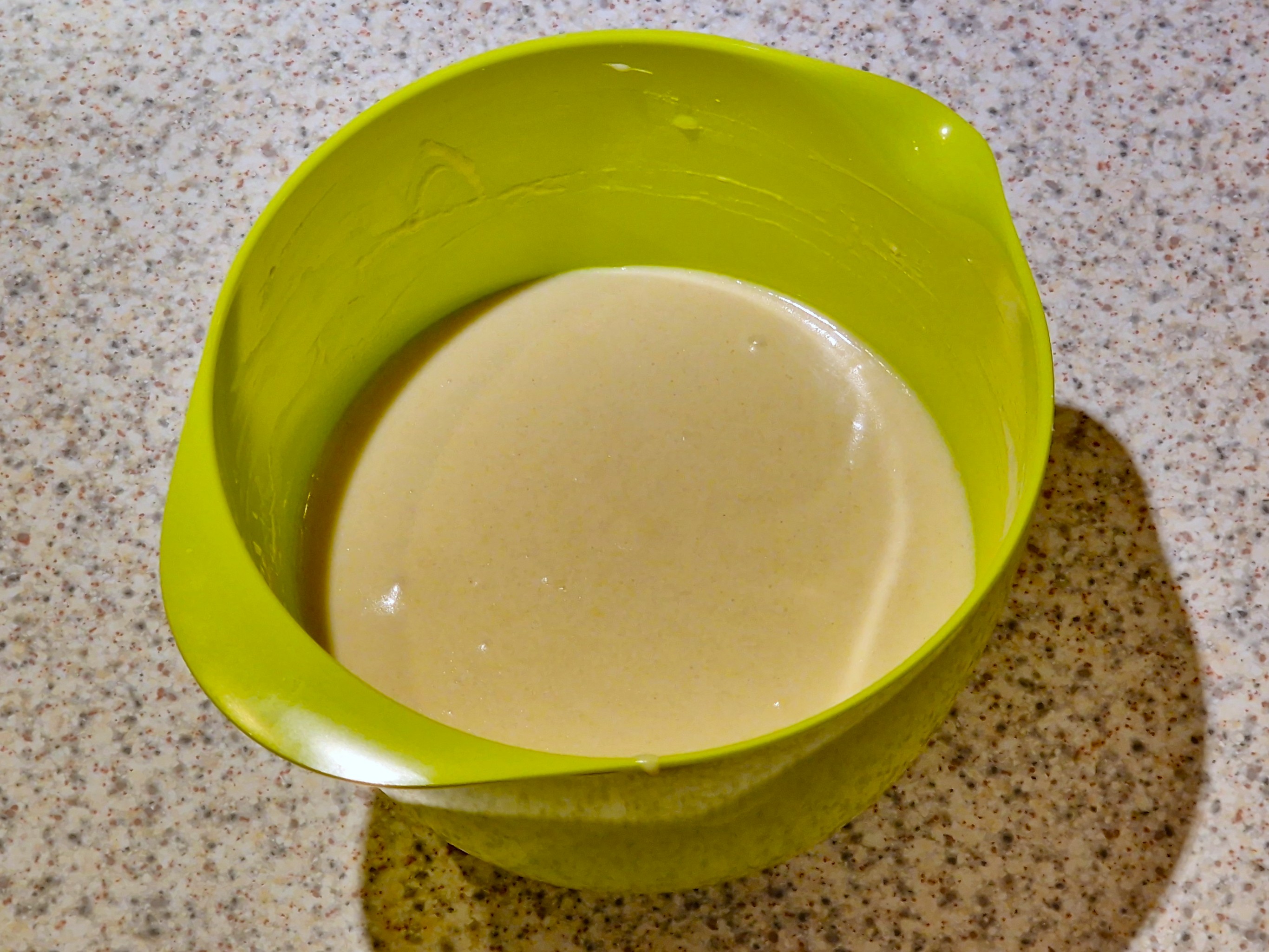 Hæld smeltet smør i og rør det forsigtigt så dejen bliver jævn.