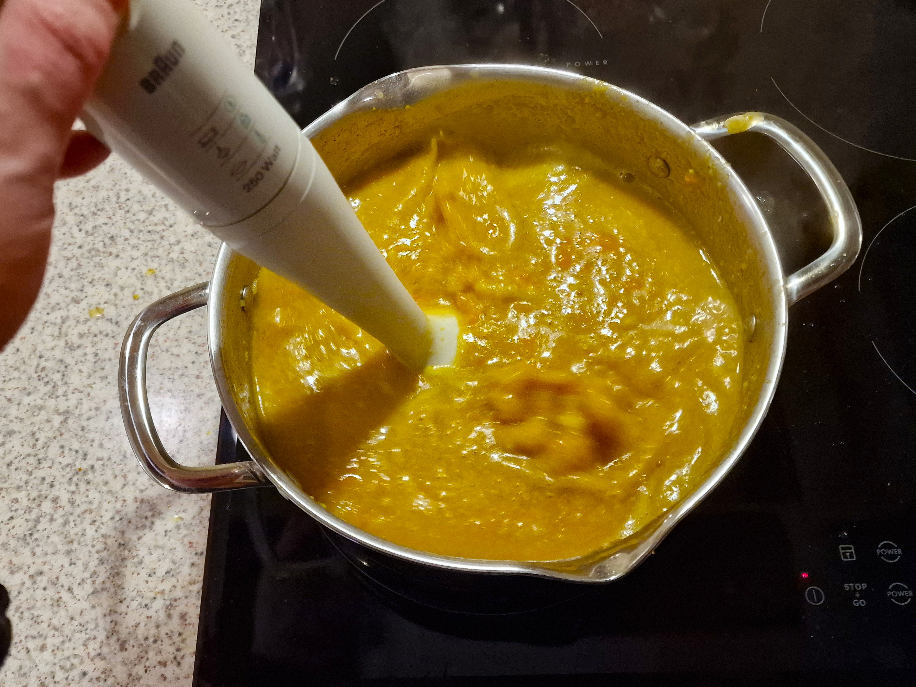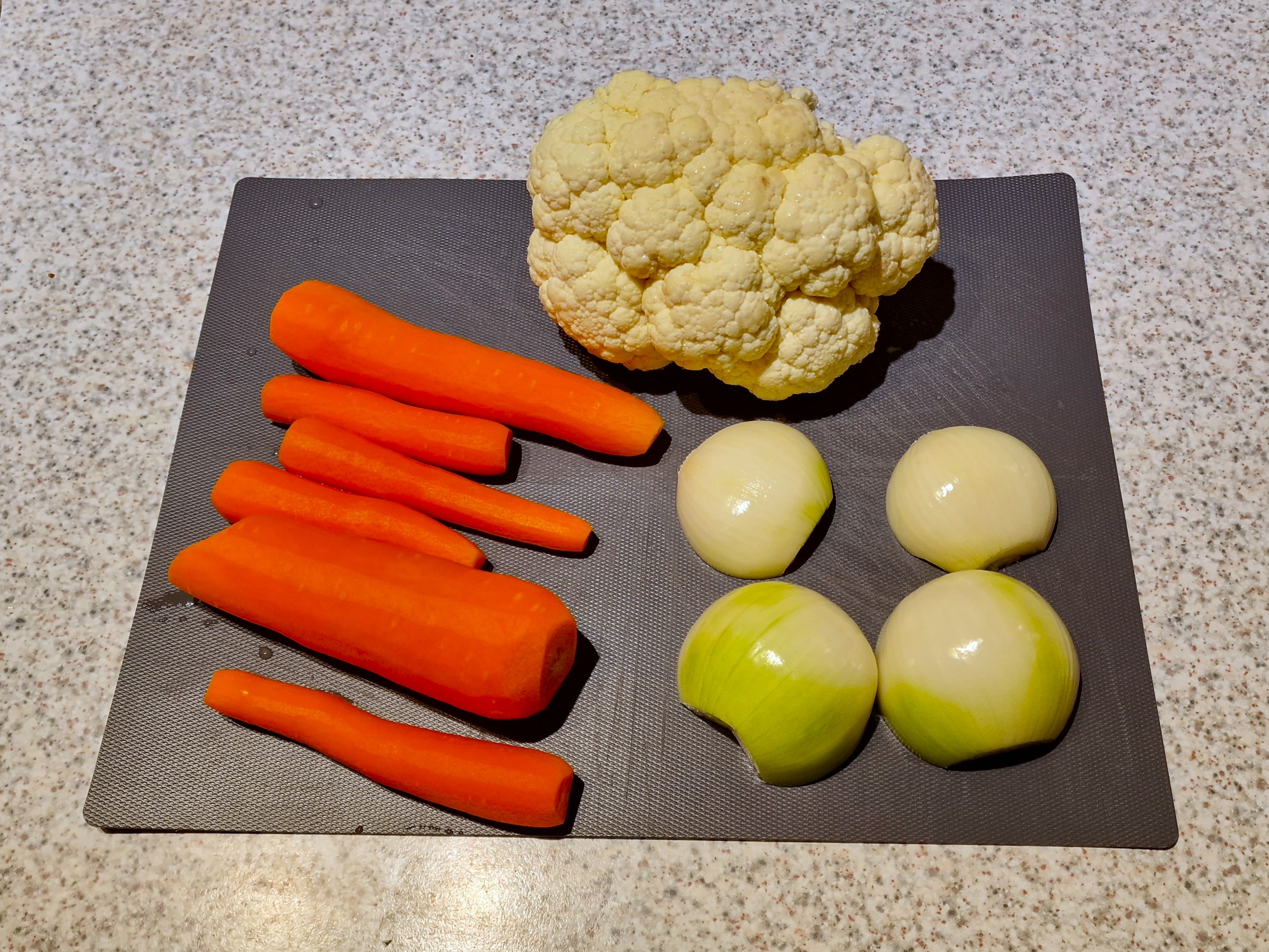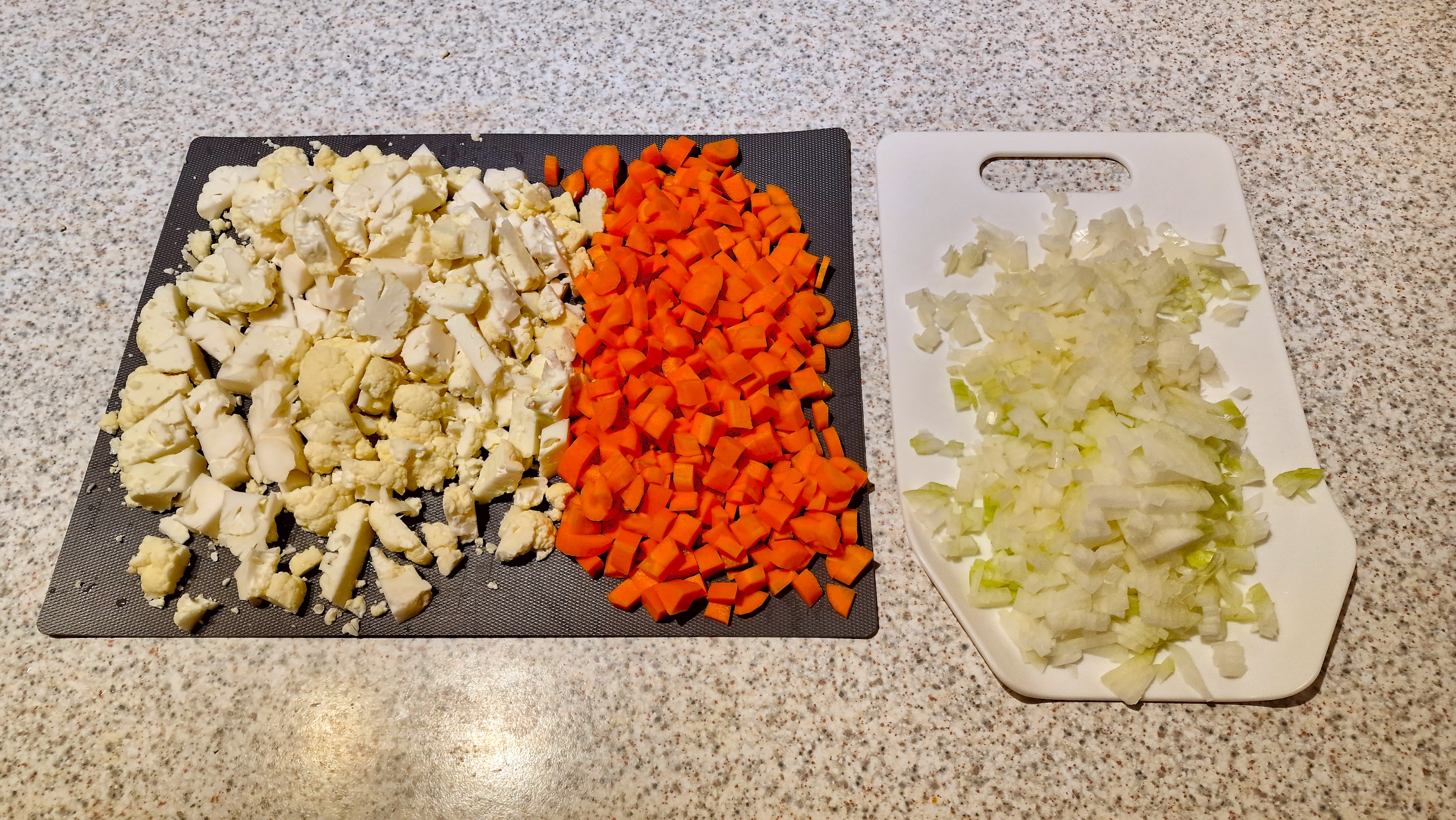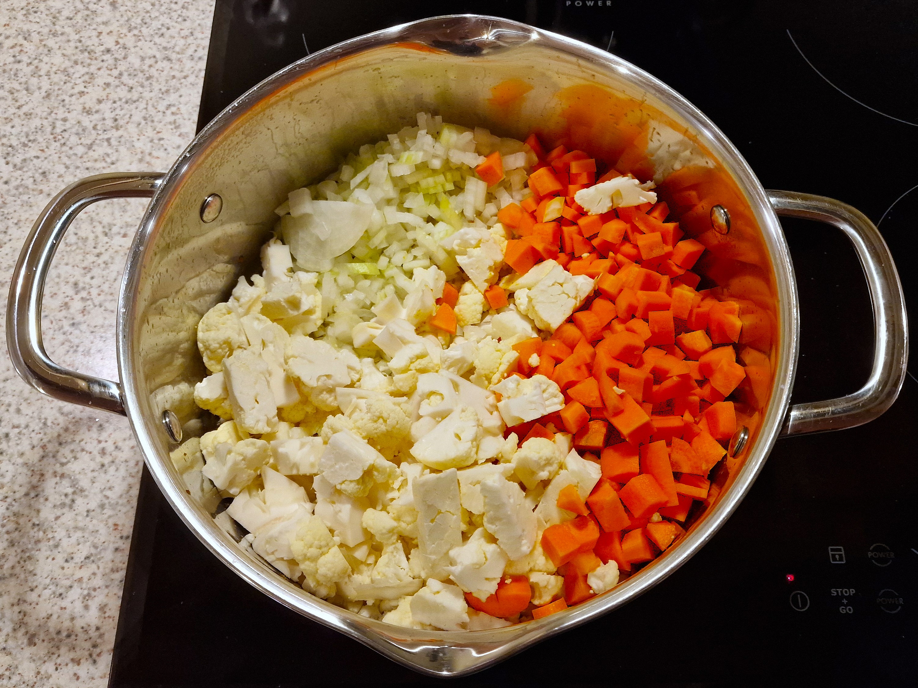 Skær gulerødder, løg og blomkålshoved i små stykker.Smelt smør og svits karrypulveret af.
