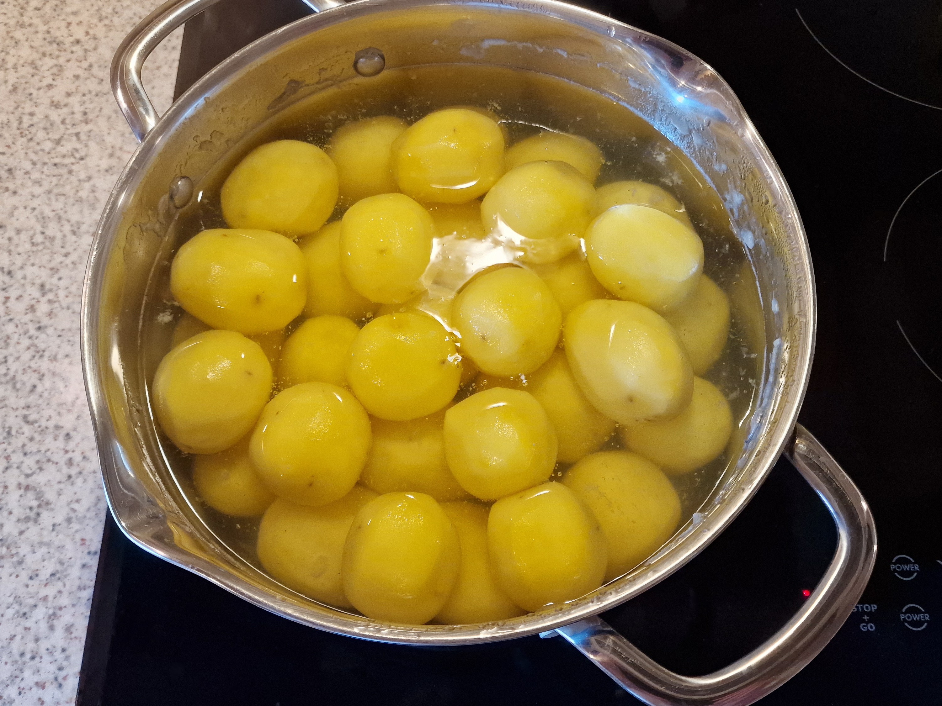 1 kg kartofler (vælg nogle faste hvis du kan)8 pølser (500 gram)