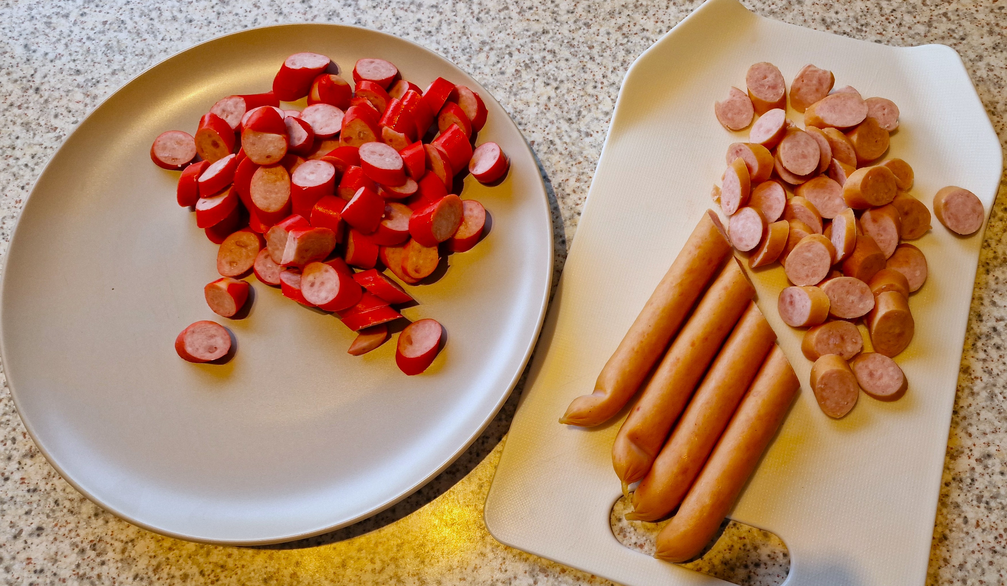 Skær pølserne i små, skrå skiver - jo mere overflade, jo mere smag